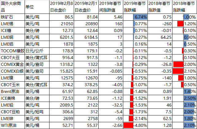 2019年春節(jié)期間,受對世界經(jīng)濟(jì)增長放緩的擔(dān)憂大宗商品價(jià)格基本以小幅度下跌為主,其中尤以原油價(jià)格下跌為甚。