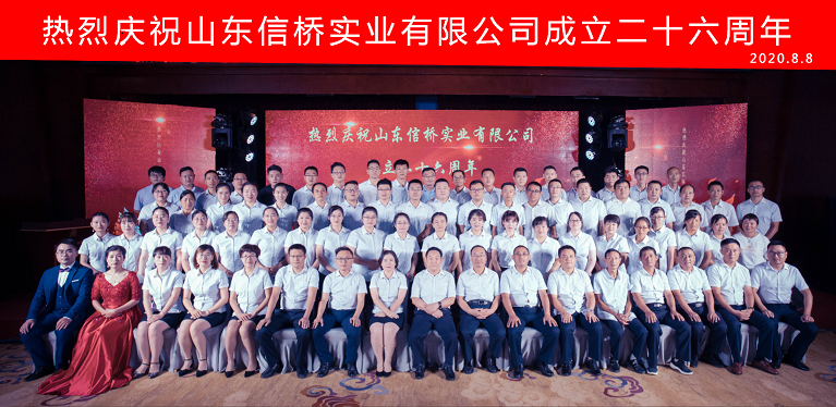 2020年8月8日,山東信橋?qū)崢I(yè)有限公司二十六周年慶典在泰安帝苑酒店隆重舉行。各路榜樣精英、以及二十六年來給予信橋厚愛的各級領導、各位同仁、新老朋友在這里歡聚一堂,與為公司付出辛勤勞動的全體員工一起,分享屬于大家的光榮與快樂!
