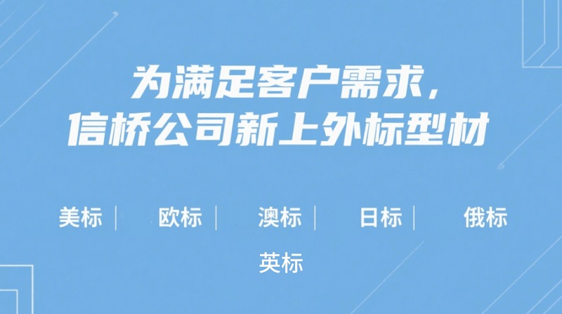 為提供更好的服務(wù),信橋公司新上外標(biāo)型材:美標(biāo)、歐標(biāo)、澳標(biāo)、英標(biāo)、日標(biāo)、俄標(biāo)。